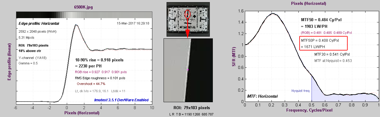2、选用MTF50P的数值为参考标准,因为将原始MTF 影像降低50%的明亮度来计算SFR,这样的做法可以继保留影像细节又不会被测试图上的杂点所干扰,如上图(右)所示。