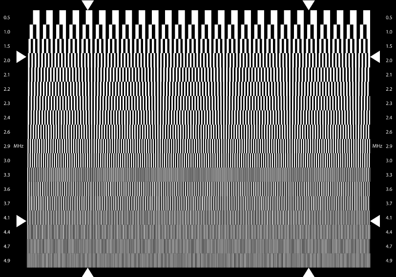 上部场具有0.5MHz的频率,并且用作参考值。还有以下频率: 1.0,1.5,2.0,2.1,2.2,2.3,2.4,2.6,2.9,3.0,3.3,3.6,3.7,4.1,4.4,4.7,4.9 MHz 频率标记在图像的左边缘和右边缘。